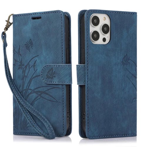 Funda para Teléfono iPhone 13 Pro Max Cuero Relieve Mariposa Orquídea (Azul)
