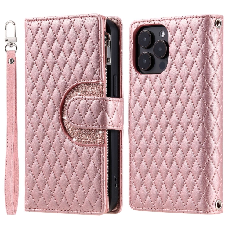 Funda de Cuero para iPhone 13 Pro Max Glitter Lattice Zipper Wallet (Oro Rosa)