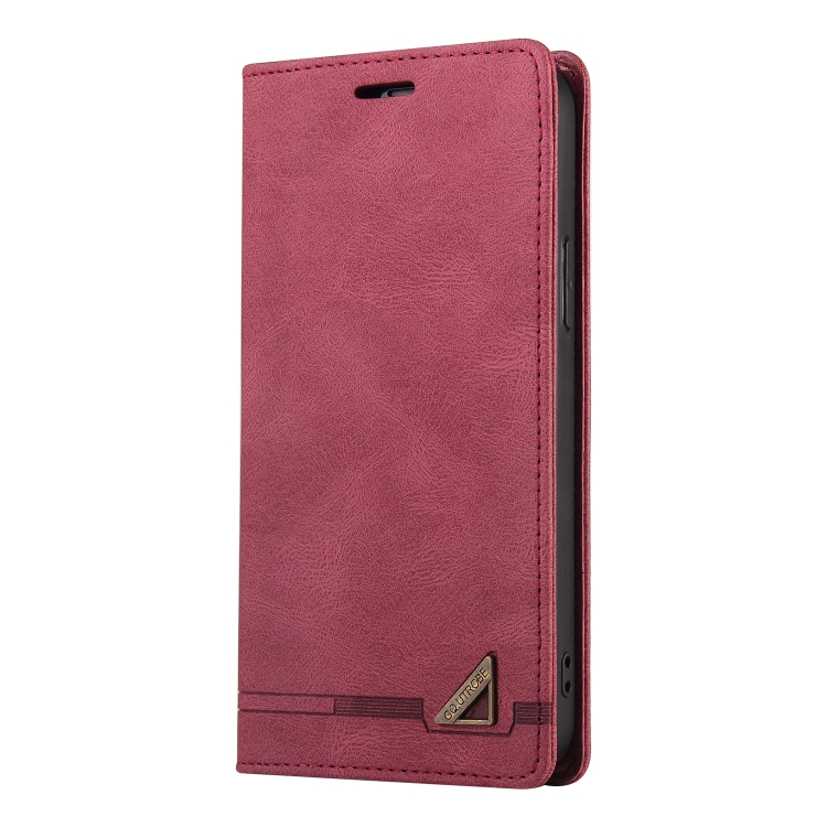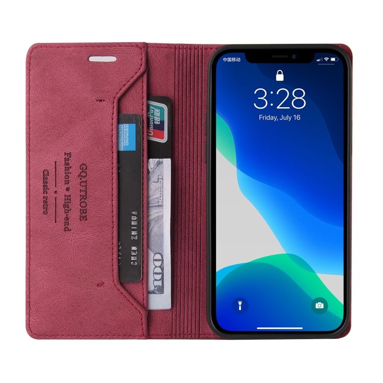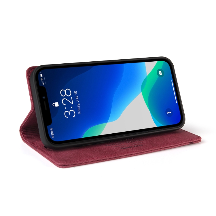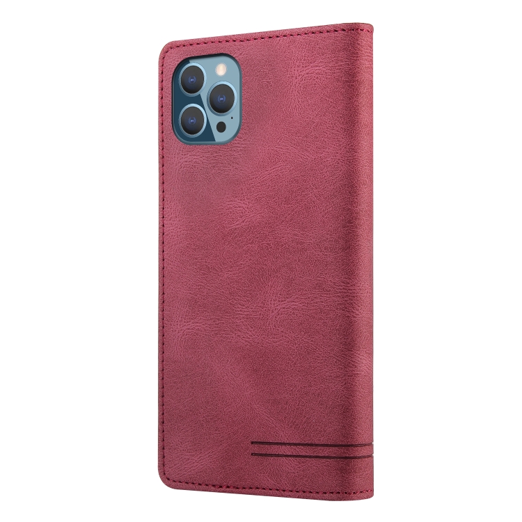Funda de Cuero para iPhone 13 Pro Skin Feel con Tapa Horizontal Cepillo Antirrobo Soporte Ranuras para Tarjetas y Billetera (Rojo Vino)