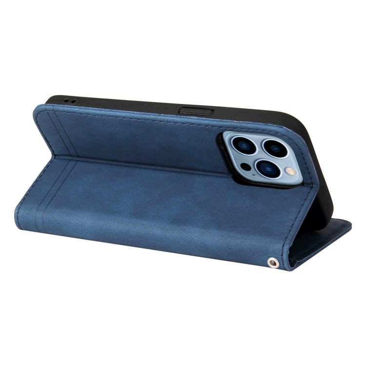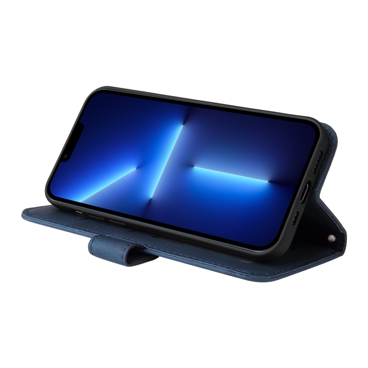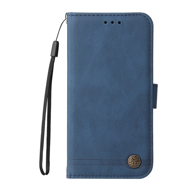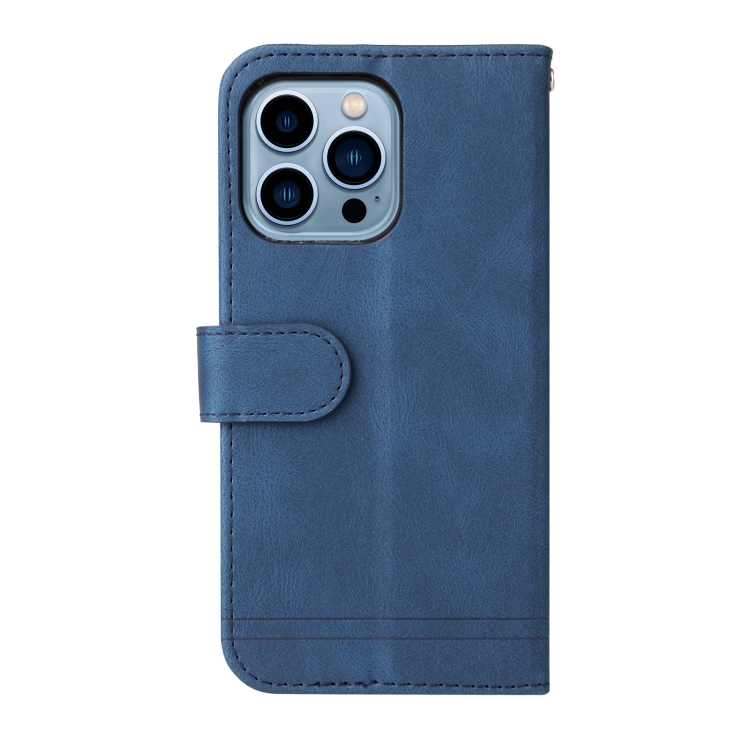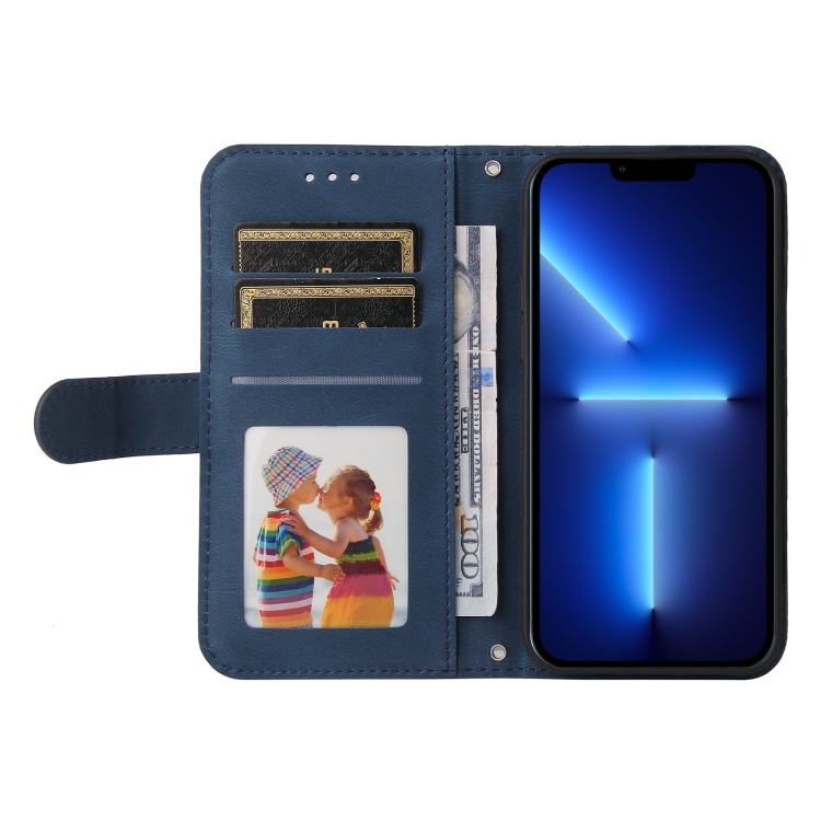 Funda de Cuero Skin Feel Life Tree para iPhone 13 Pro con Botón de Metal, Tapa Horizontal, Soporte, Ranura para Tarjeta, Billetera, Marco de Fotos y Correa (Azul)