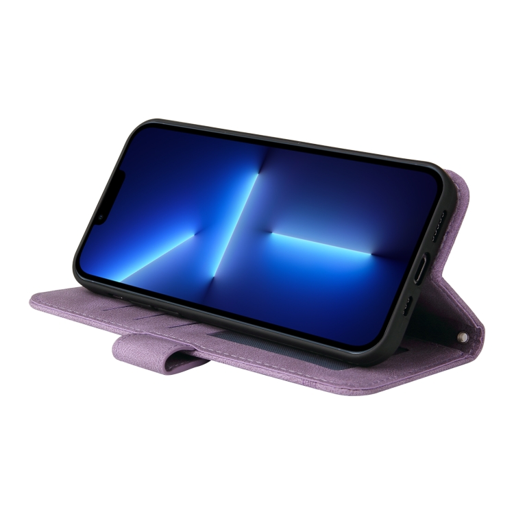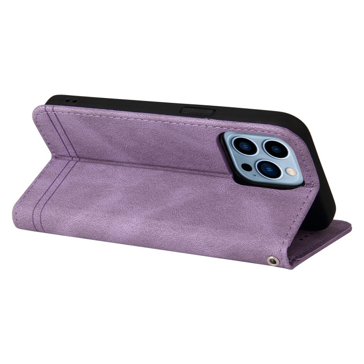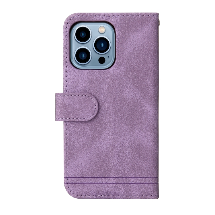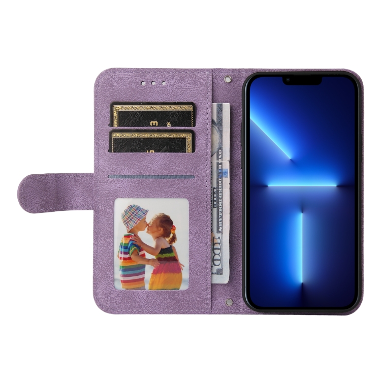 Funda de Cuero Skin Feel Life Tree para iPhone 13 Pro con Botón de Metal, Tapa Horizontal, Soporte, Ranura para Tarjeta, Billetera, Marco de Fotos y Correa (Púrpura)