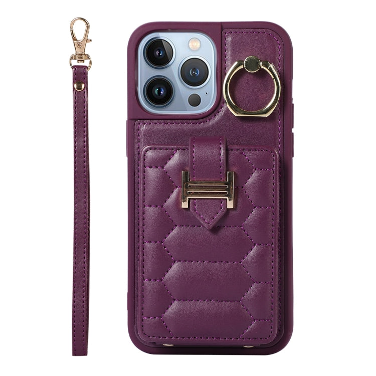 Funda para iPhone 13 Pro Vertical Card Bag Ring Holder con Doble Cordón (Morado Oscuro)