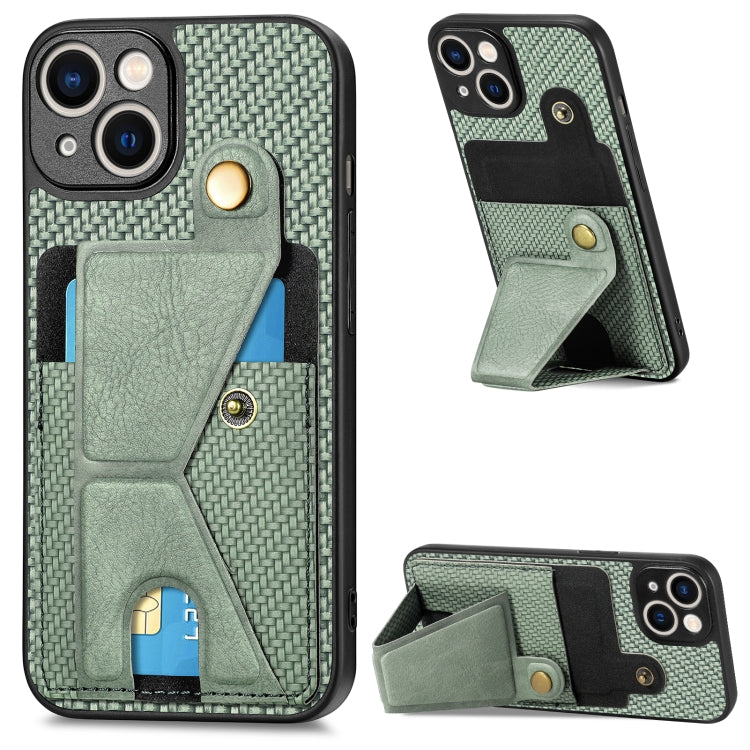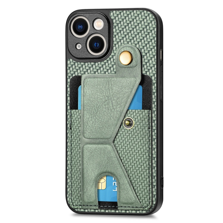 For iPhone 14 Carbon Fiber Wallet Flip Card Phone Case with K-shaped Holder (Green)