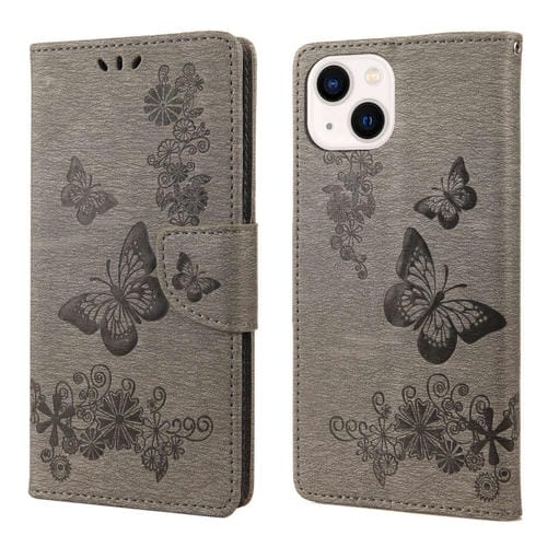 Pour iPhone 14 Étui de téléphone en cuir à rabat horizontal en relief papillon (gris)