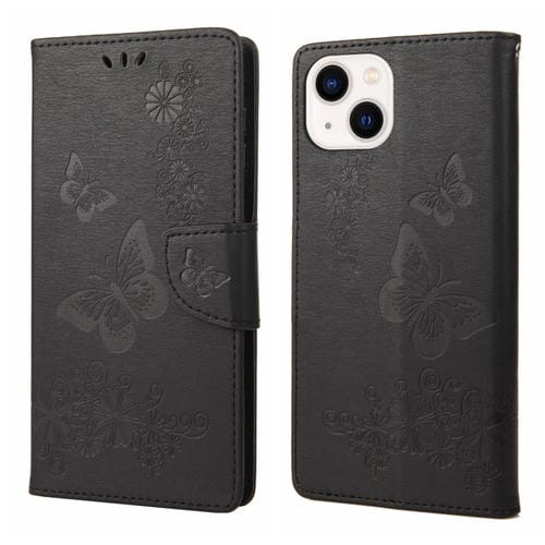 Pour iPhone 14 Étui de téléphone en cuir à rabat horizontal en relief papillon (Noir)