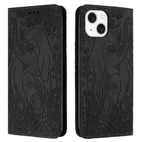 Funda de Teléfono iPhone 14 Cuero Relieve Elefante Retro (Negro)