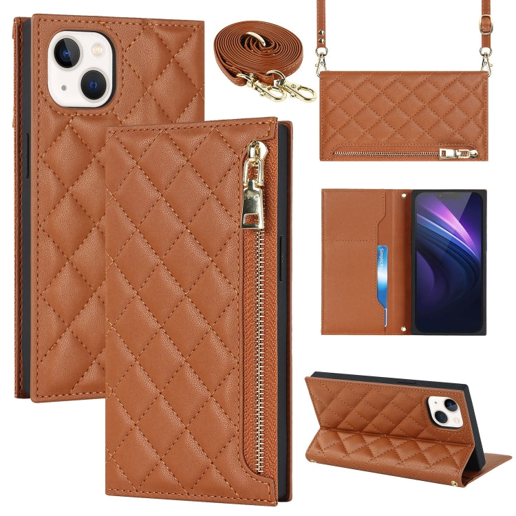 Funda de Cuero con Cremallera para iPhone 14 Grid Texture Lanyard (Marrón)