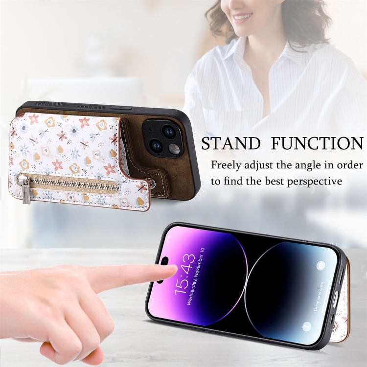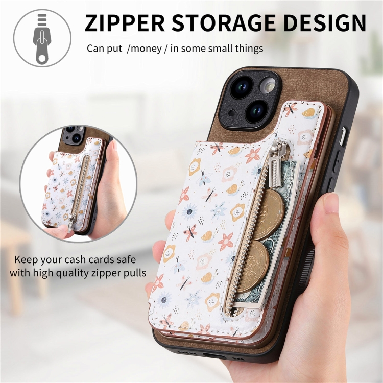 Estuche para teléfono iPhone 14 Pro Max con billetera y cremallera pintada retro (Marrón)
