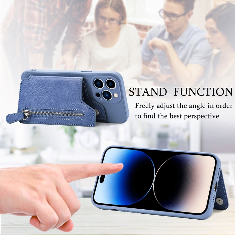 For iPhone 14 Pro Max Zipper Case Leather Back Shockproof Phone Case (Blue)