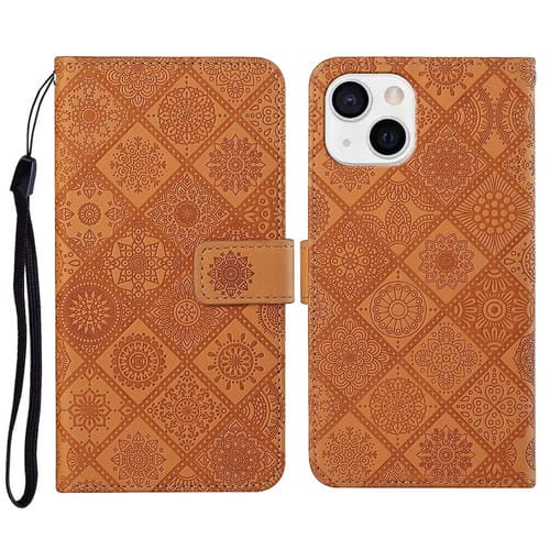 Estuche para teléfono iPhone 15 cuero patrón en relieve estilo étnico (Marrón)