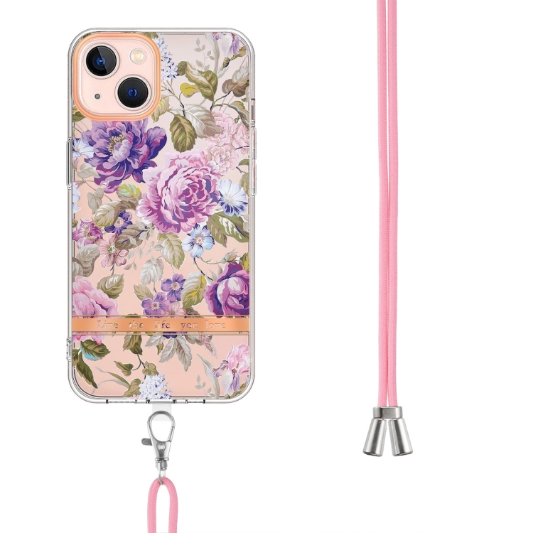 Funda para Teléfono TPU iPhone 15 Serie IMD Flores y Plantas con Cordón (Purple Peony)