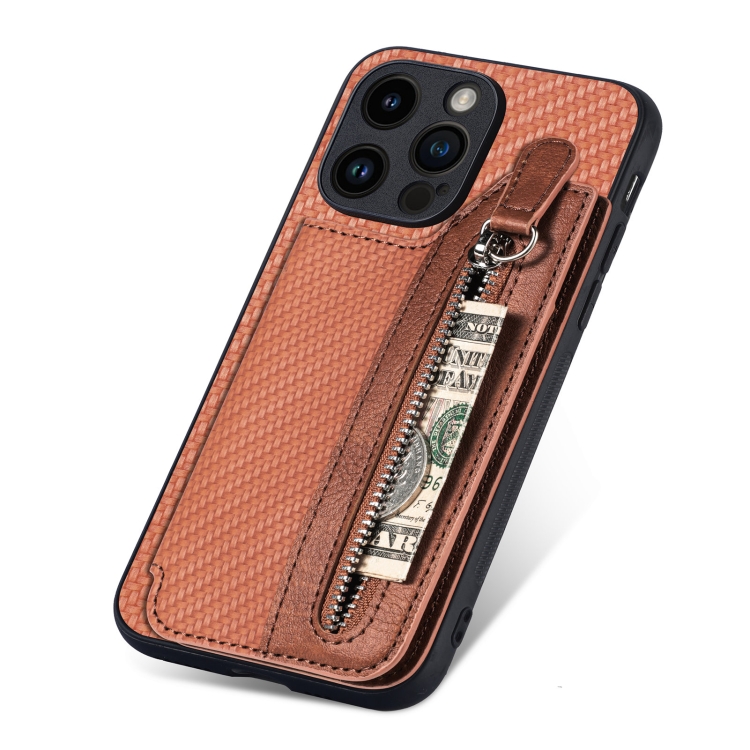 Funda para Teléfono iPhone 15 con Billetera Cremallera Tapa Horizontal Fibra de Carbono (Marrón)