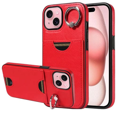 Pour iPhone 15 Étui de téléphone avec support de bague de fente de carte de texture de veau (rouge)