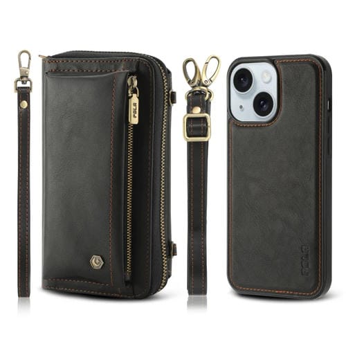 Funda para Teléfono iPhone 15 Cuero con Billetera y Cremallera Multifuncional Cruzada (Negro)