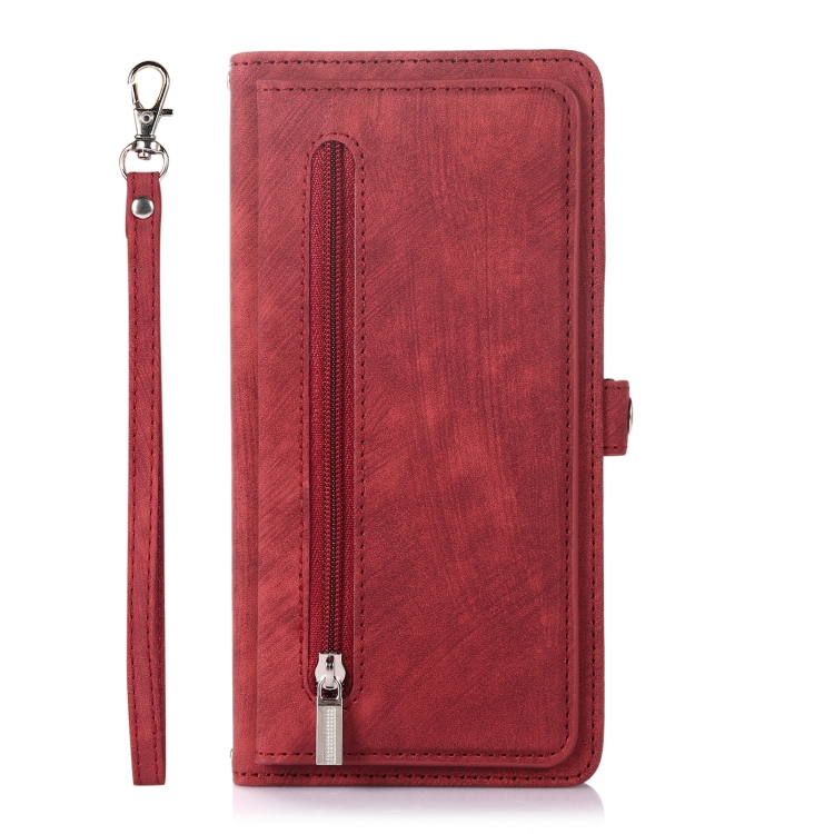 Funda de Cuero para iPhone 15 Plus con Cremallera Ranura para Tarjeta Hebilla Monedero (Rojo)