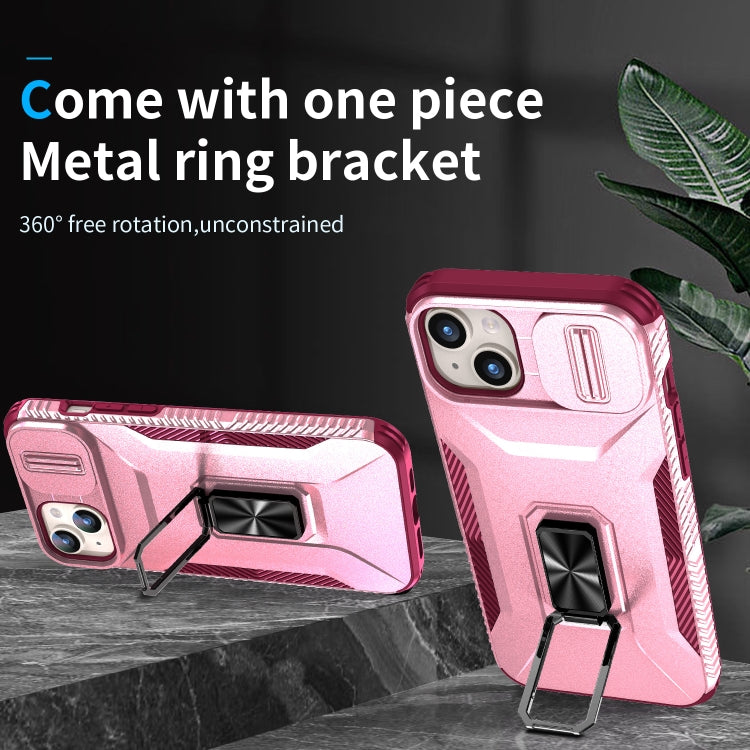 Estuche para teléfono iPhone 15 Plus con soporte deslizante para levas (Rosa + Rojo Rosa)