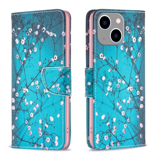Estuche para Teléfono iPhone 15 Plus Cuero Patrón Dibujo Coloreado (Flor del Ciruelo)