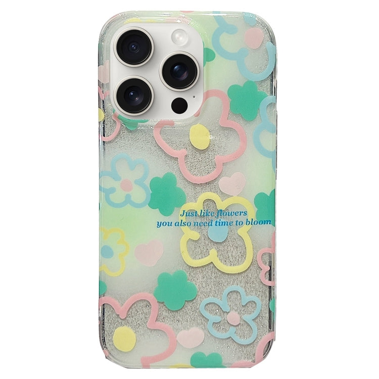 Estuche para teléfono TPU iPhone 15 Pro cobertura total IMD doble cara línea de gancho (Flores Azules, Amarillas y Rosadas)
