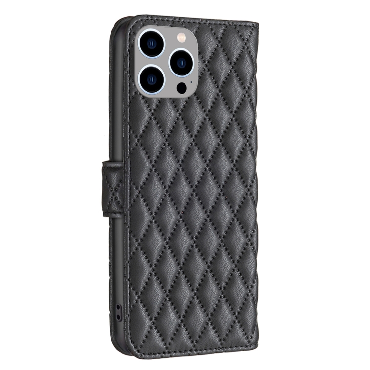 Pour iPhone 15 Pro Max Diamond Lattice Wallet Flip Leather Phone Case (Noir)