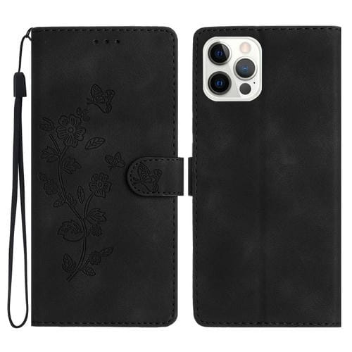 Funda para iPhone 15 Pro Max Cuero Flor Mariposa Relieve Patrón (Negro)