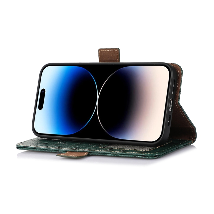 Funda de Teléfono iPhone 15 Pro Max Patrón de Avestruz Rfid Cuero Genuino (Verde)