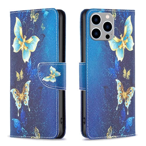 Pour iPhone 15 Pro Max Étui de téléphone à rabat en cuir à motif de dessin coloré (papillon doré)