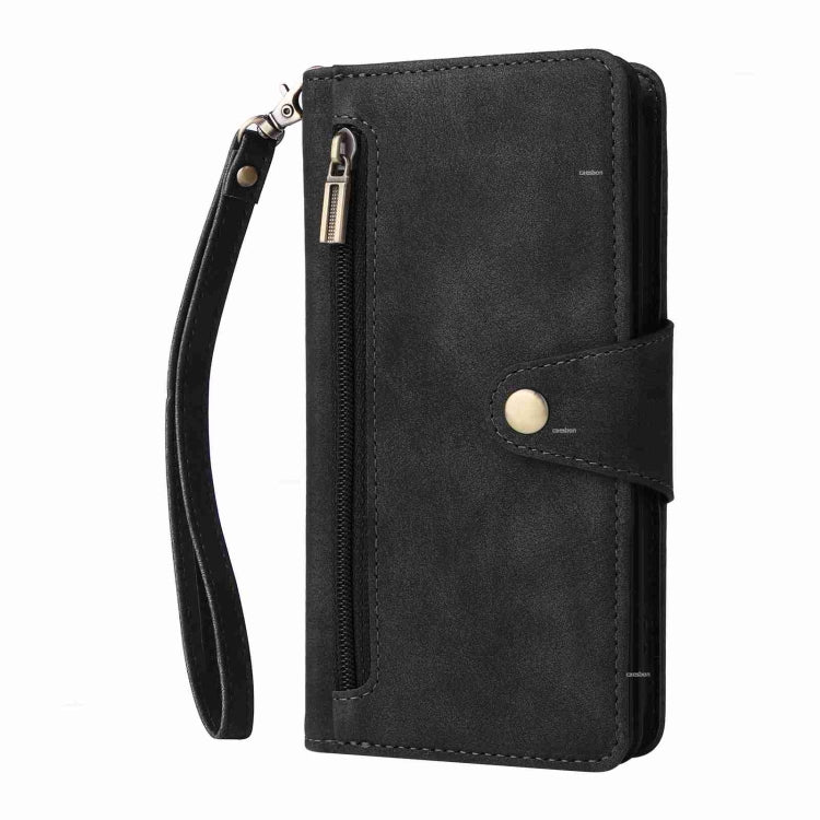 Funda de Cuero para iPhone 15 Pro Max con Remache Hebilla y 9 Tarjetas Tres Pliegues (Negro)