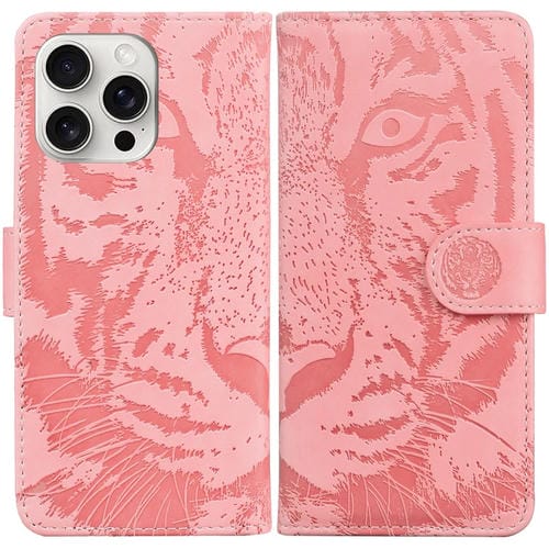Estuche de Cuero para iPhone 16 Pro Max con Patrón de Relieve de Tigre (Rosa)
