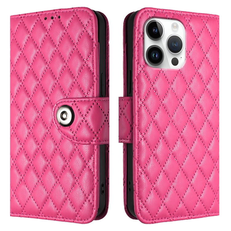 Funda para teléfono iPhone 16 Pro Max con tapa de cuero textura rómbica y cordón (Rojo Rosa)