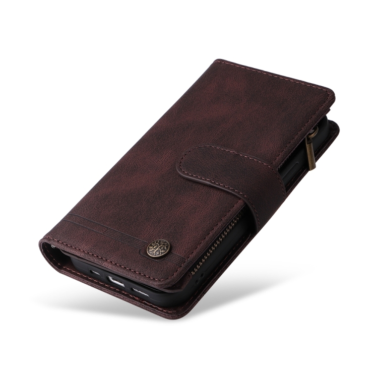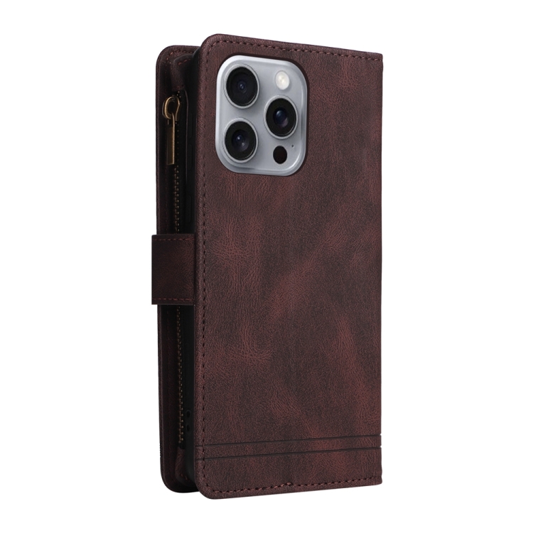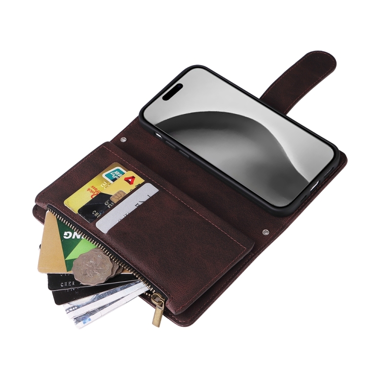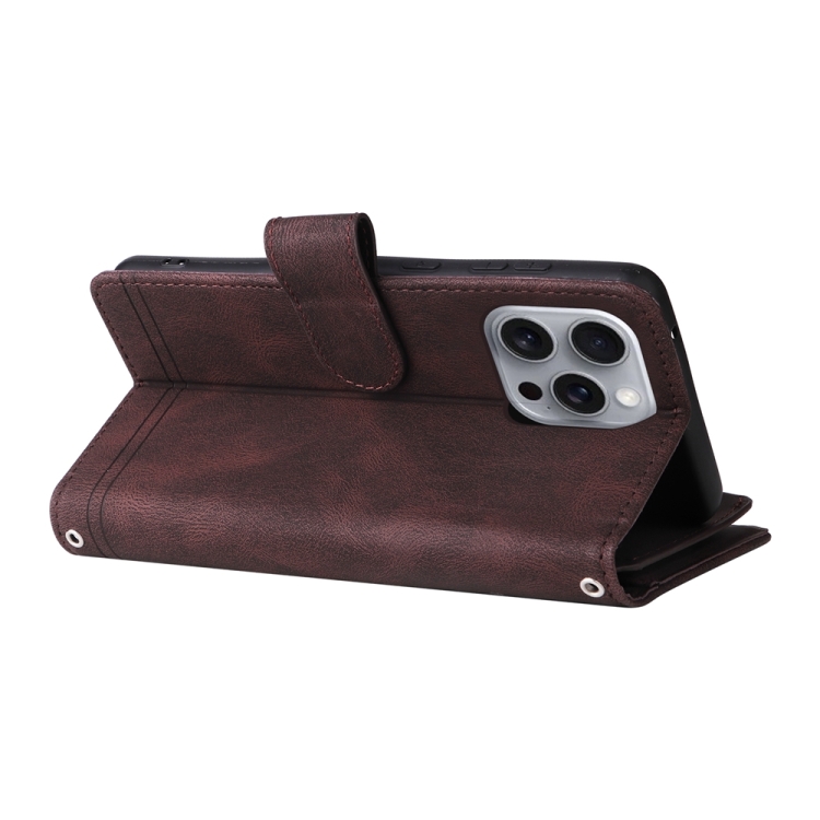 Funda para Teléfono iPhone 16 Pro Max Skin Feel Cuero con Cremallera y Billetera Múltiples Tarjetas (Marrón)