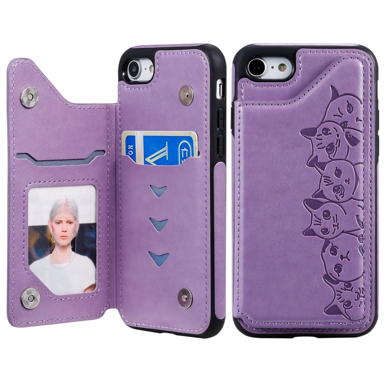Pour iPhone 7/8 Étui de protection à motif en relief Six Cats avec support, fentes pour cartes et cadre photo (violet)