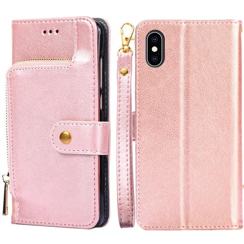 Bolso con Cremallera PU + TPU Funda de Cuero para iPhone X / Xs con Tapa Horizontal, Soporte, Ranura para Tarjeta y Billetera (Dorado)