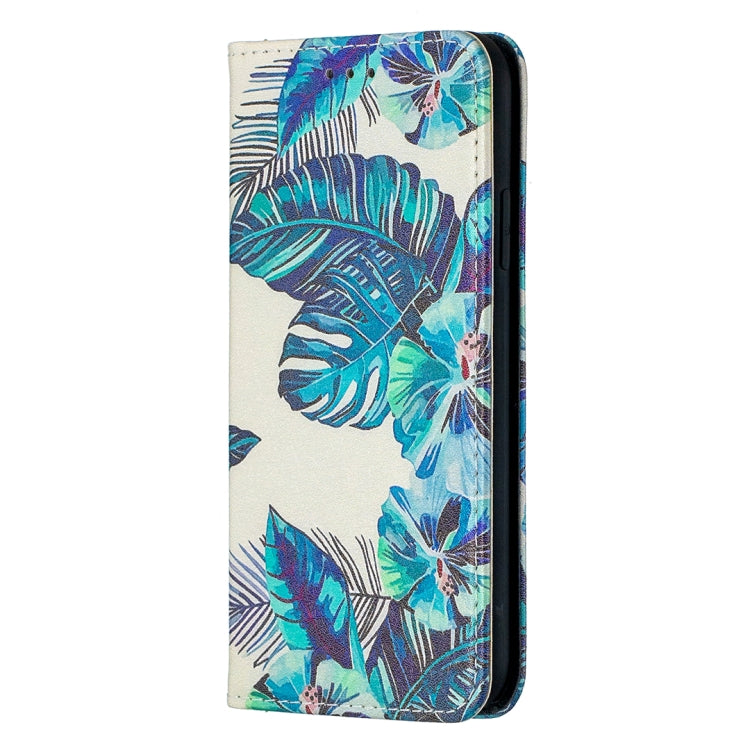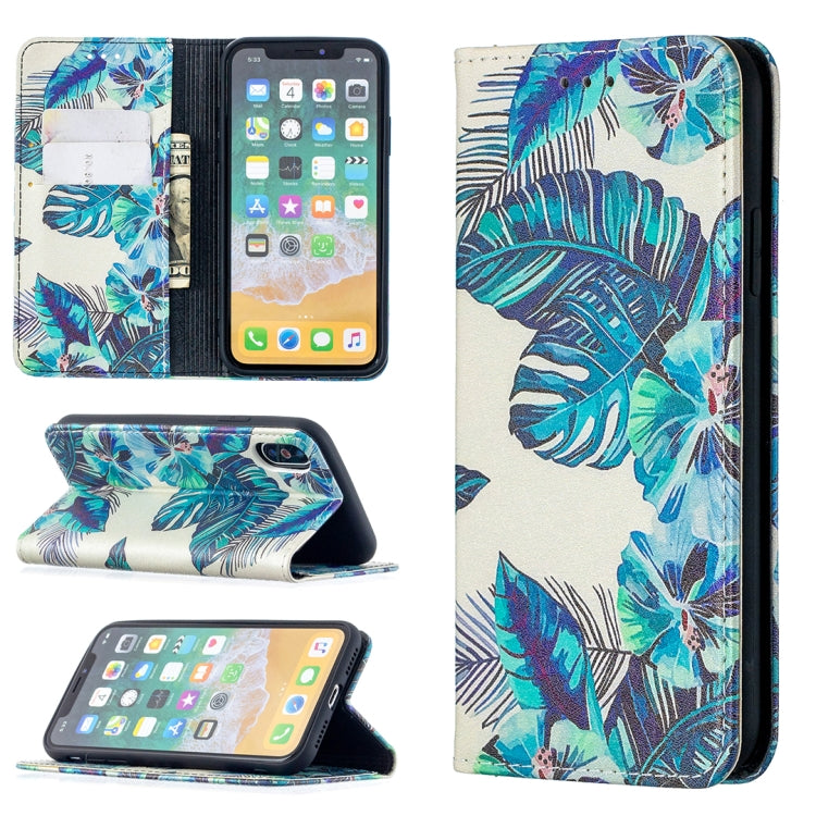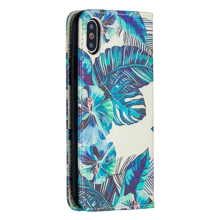 Estuche de Cuero PU para iPhone X / Xs con Patrón de Dibujo a Color, Tapa Magnética Invisible, Soporte y Ranuras para Tarjetas (Hojas Azules)