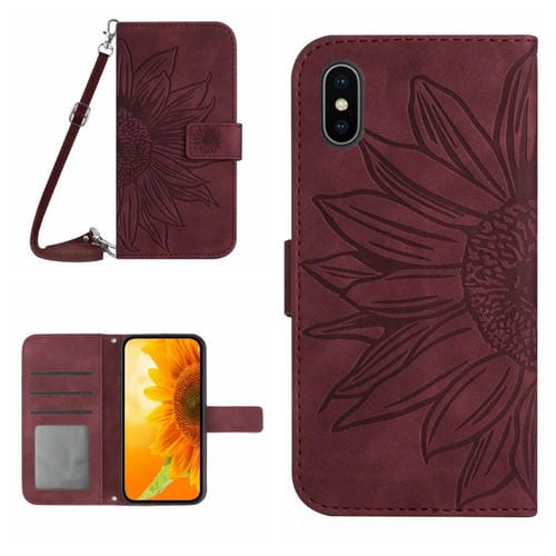 For iPhone X/XS Skin Feel Sun Flower Pattern Flip Leather Phone Case Cover with Lanyard(Wine Red)