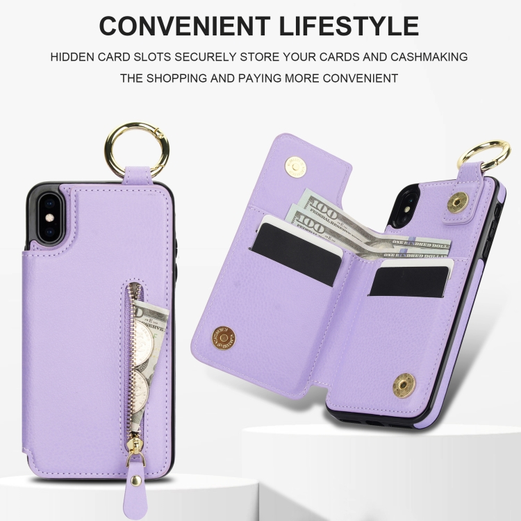 Funda para Teléfono iPhone Xs X con Bolsa para Tarjetas Doble Hebilla Cremallera Textura Litchi (Púrpura)