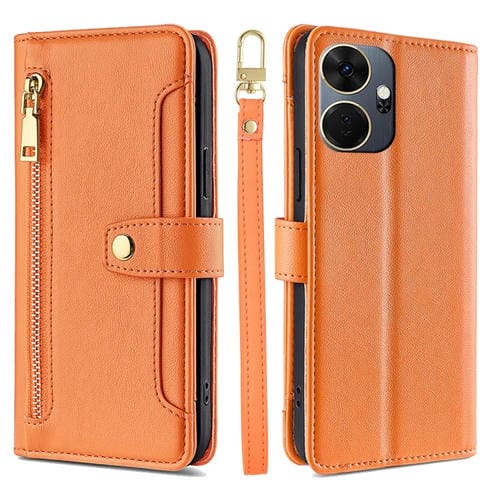 Funda de Cuero para Itel P55 + 4G con Billetera, Cremallera y Textura de Oveja (Naranja)