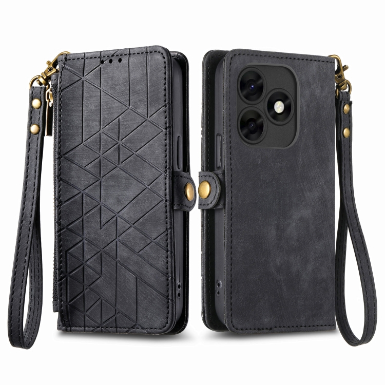 Funda de Cuero para Itel S23 con Hebilla Lateral y Billetera con Cremallera Geométrica (Negro)