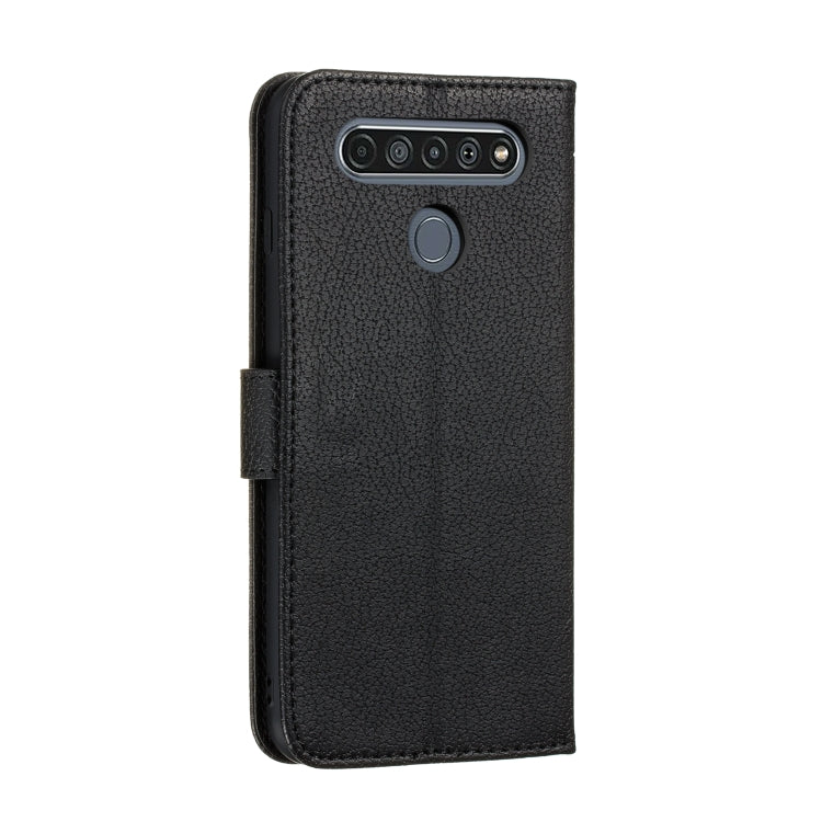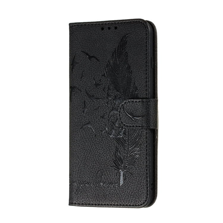 Estuche de Cuero para LG K61 con Tapa Horizontal, Textura Litchi, Diseño Plumas, Billetera y Soporte (Negro)
