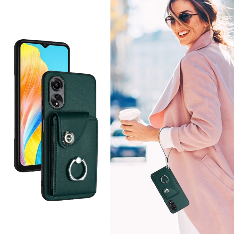Para Oppo A38 4G / A18 4G Bolsa para Tarjeta de Órgano Global Soporte para Anillo Funda para Teléfono Pu con Cordón (Verde)