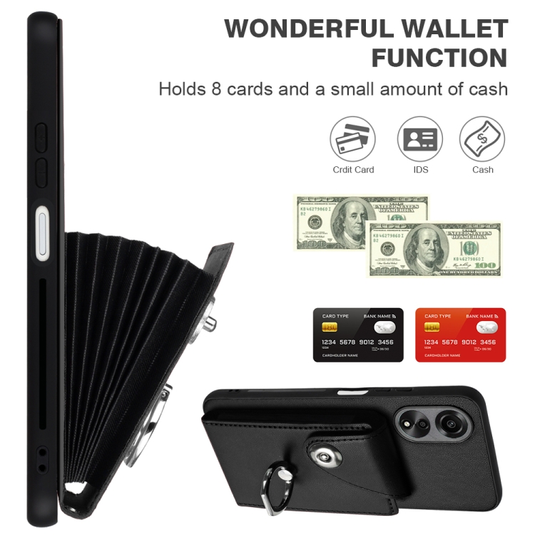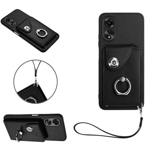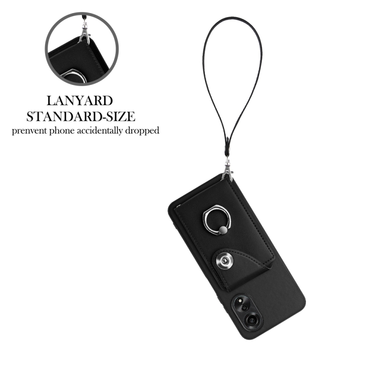 Para Oppo A58 4G Global Organ Card Bag Ring Holder Pu Funda para Teléfono con Cordón (Negro)