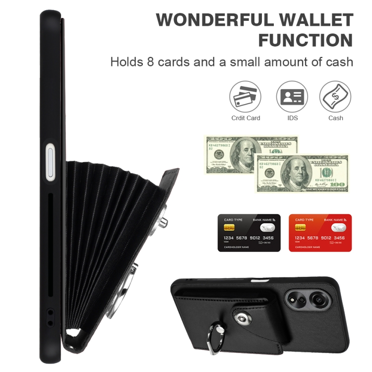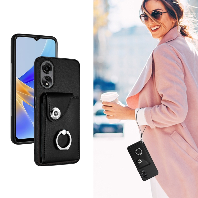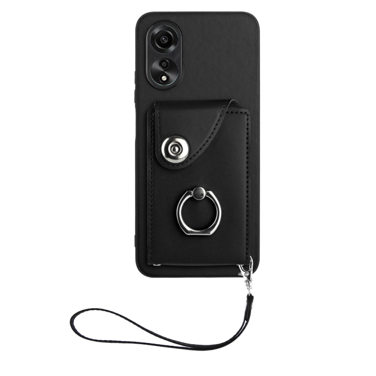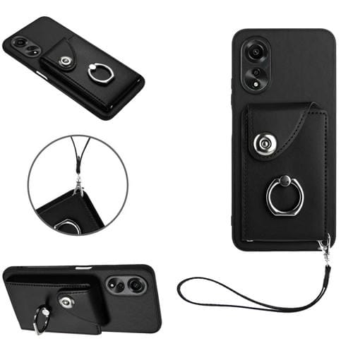 Para Oppo A58 / A58X / A78 5G / A1X / A2X Bolsa para Tarjeta de Órgano Soporte para Anillo Funda para Teléfono Pu con Cordón (Negro)