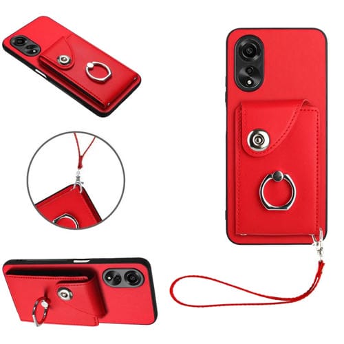 Para Oppo A58 / A58X / A78 5G / A1X / A2X Bolsa para Tarjeta de Órgano Soporte para Anillo Funda para Teléfono Pu con Cordón (Rojo)