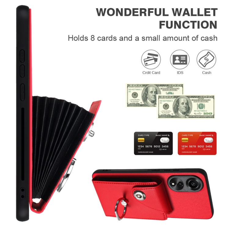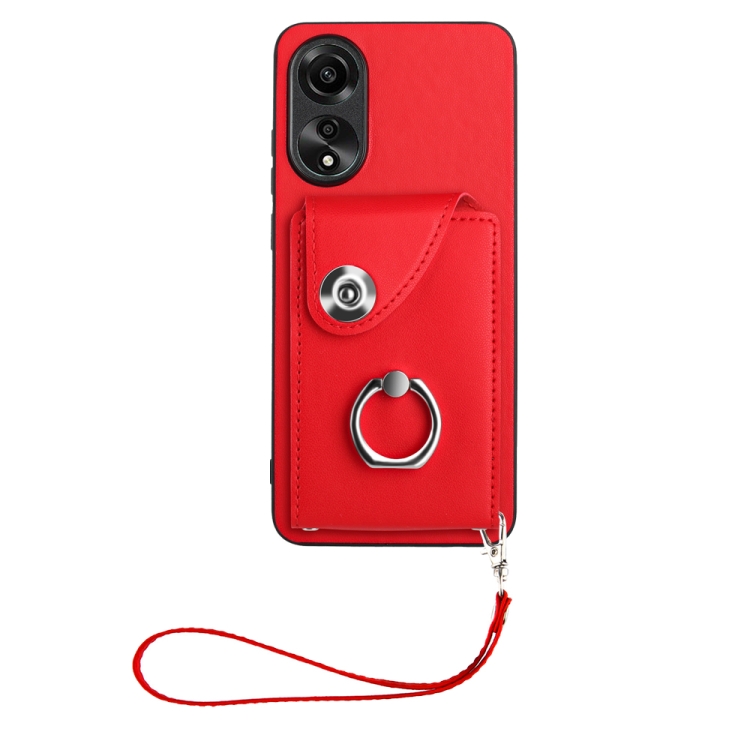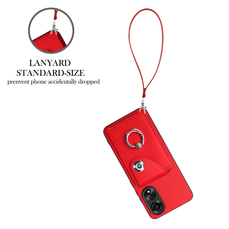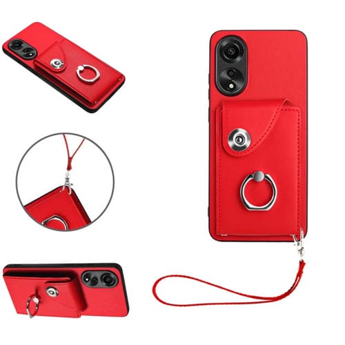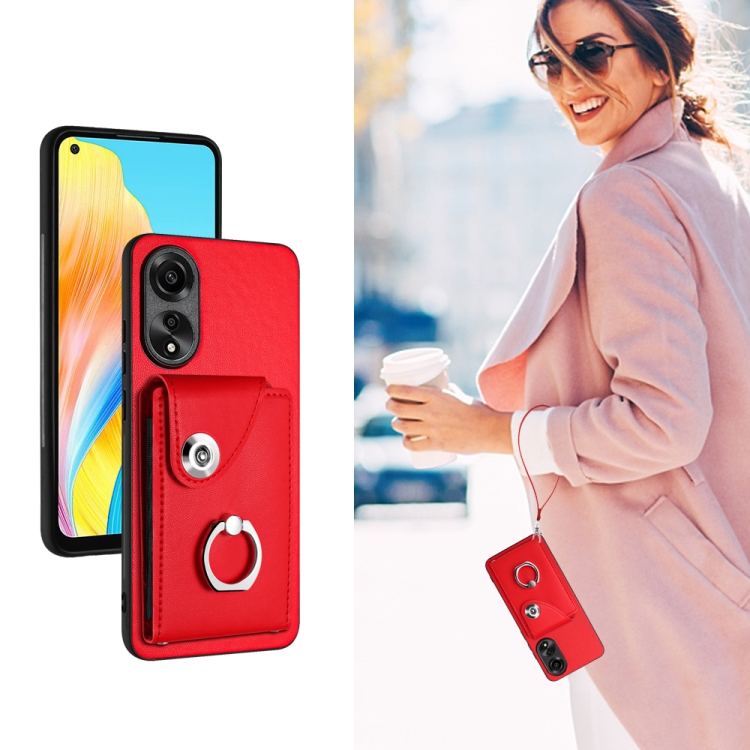 Para Oppo A78 4G Global Organ Card Bag Ring Holder Funda para Teléfono Pu con Cordón (Rojo)
