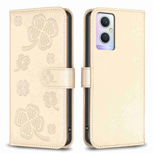 Para Oppo A96 5G / Reno7 Z Funda para Teléfono de Cuero con Relieve de Cuatro Hojas (Dorado)