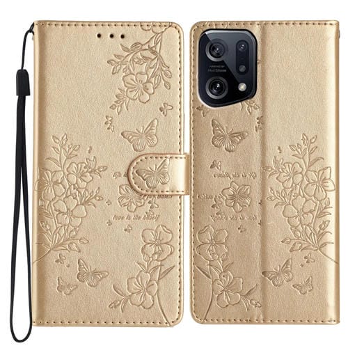 Para Oppo Find X5 Funda para Teléfono de Cuero con Relieve de Flor de Amor y Mariposa (Dorado)