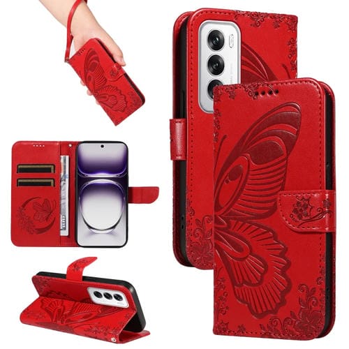Para Oppo Reno12 5G Global Swallowtail Butterfly Funda de Cuero para Teléfono En Relieve (Rojo)