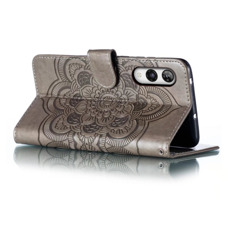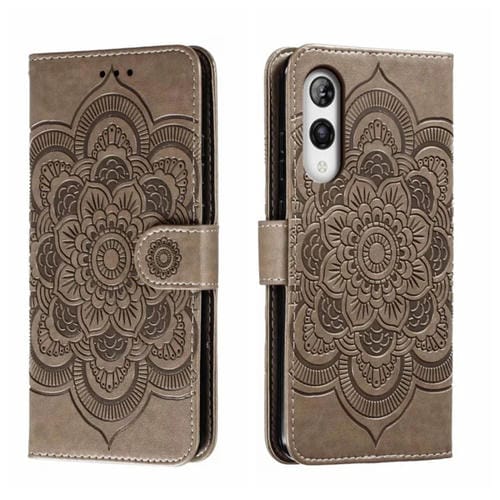 Funda de Cuero para Rakuten Hand 5G con Patrón en Relieve Sun Mandala (Marrón)