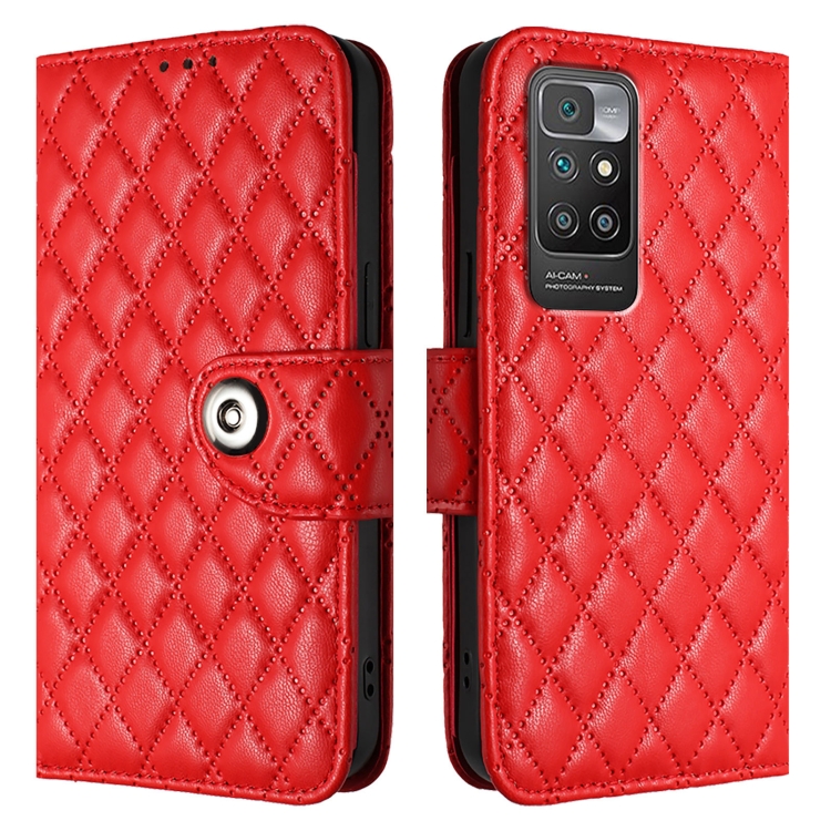Para Redmi 10 / Redmi 10 2022 Funda para Teléfono de Cuero con Tapa con Textura Rómbica y Cordón (Rojo)