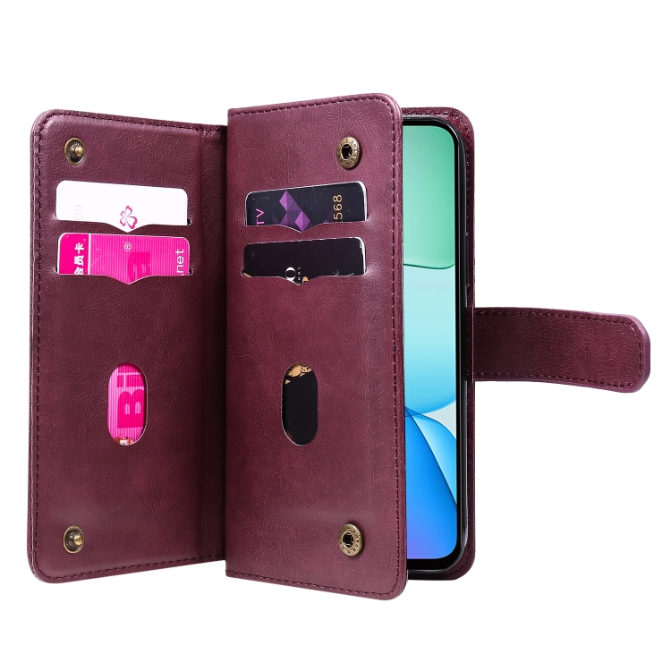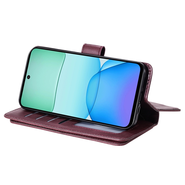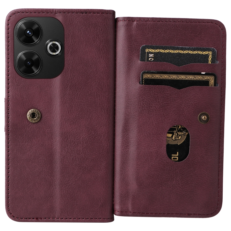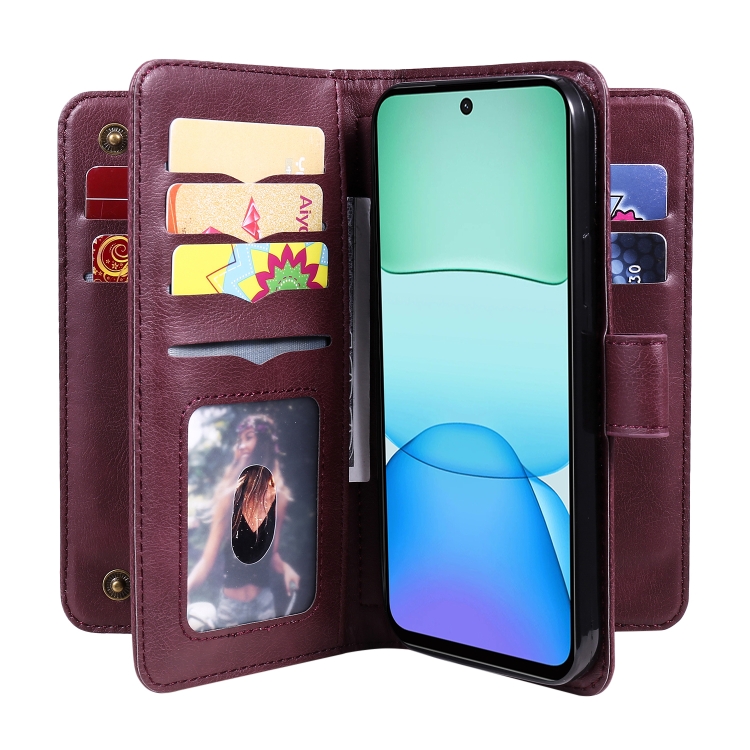 Para Redmi 13 4G Cartera Multifunción Global 10 Ranuras para Tarjetas Funda de Cuero para Teléfono (Clarete)