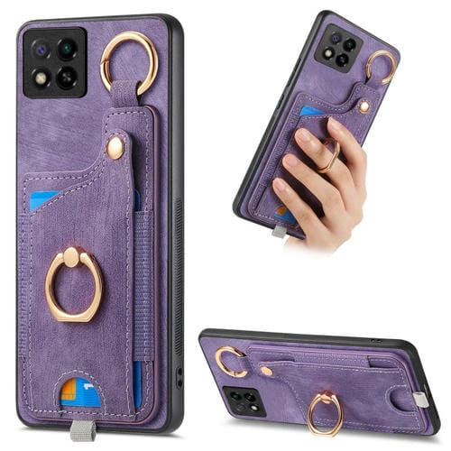 Para Redmi 9C Funda para Teléfono con Bolsa para Tarjeta con Anillo y Sensación de Piel Retro con Lazo para Colgar (Púrpura)